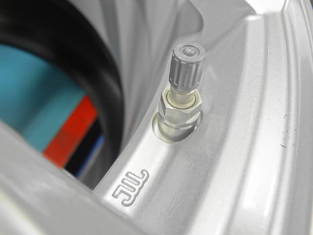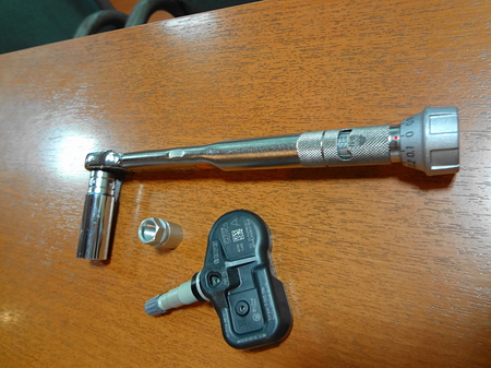 飛行機みたいな形をしているのが、センサー(エアバルブと一体型)です。丸いのが取り付け用のナット・・・L字型のモノはチビッコトルクレンチデス。当店はメーカーの取り決めトルクでキッチリ取り付けます!!