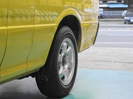 純正スチールホイールにちょい問題アリでして、アルミホイールをお買い上げ頂きました。ハイエースのスチールホイールはかなり頑丈で重めです、なのでものすごい軽量化デスよ。