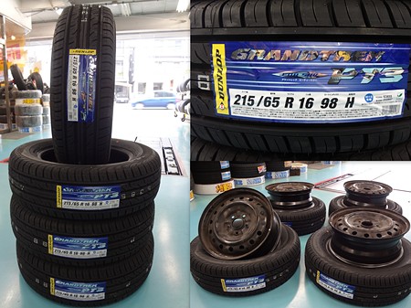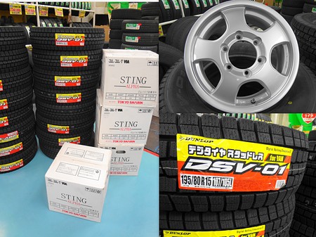 ホイールはスティングアルファ、タイヤはダンロップDSV-01 195/80R15です。